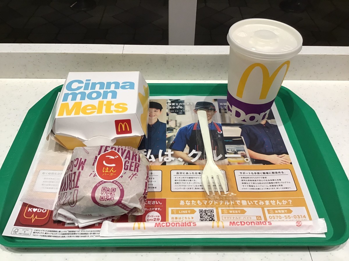 2020-02-26 昼食 食事 マクドナルド(江の島店)でごはんてりやき、シナモンメルツ、マックシェイクバニラ(M)。計840円。 ごはんバーガーはSNSでよくない言われ方をしていたので、ためしに注文。おいしく食べられたけど、ソースで包み紙がべちゃべちゃ。いい気分はしなかった。バンズよりカバー面積が小さいのかな。 シナモンメルツ。メニュー写真ではよくわからなかったけど、パンを使っている。おいしい・まずいの二択ならおいしい。ただ、また注文する感じではなかった。情報を食べるという行為をすれば十分だなーと。