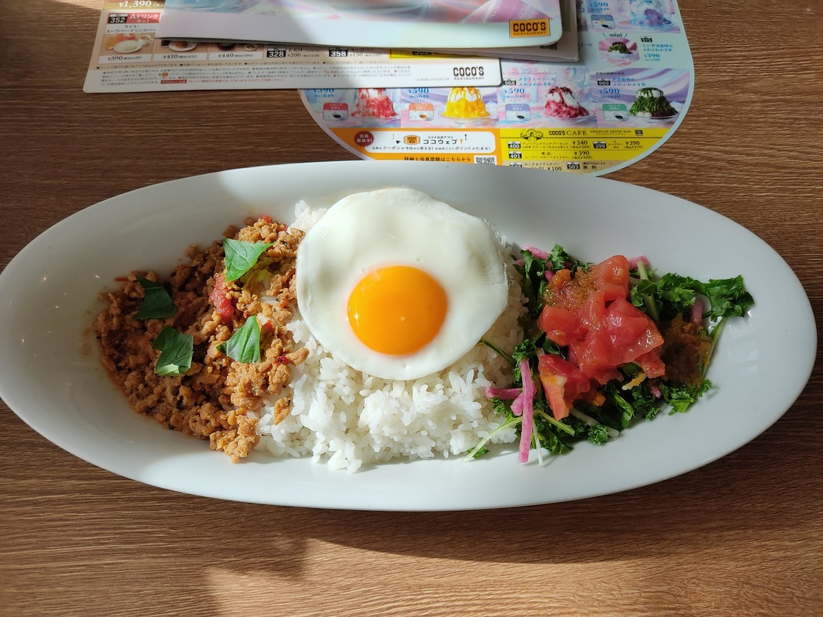 ココス(鎌倉大船店)でガパオライスランチとピスタチオ&チョコクリスピーのふわふわかき氷。計1518円(869円、649円)