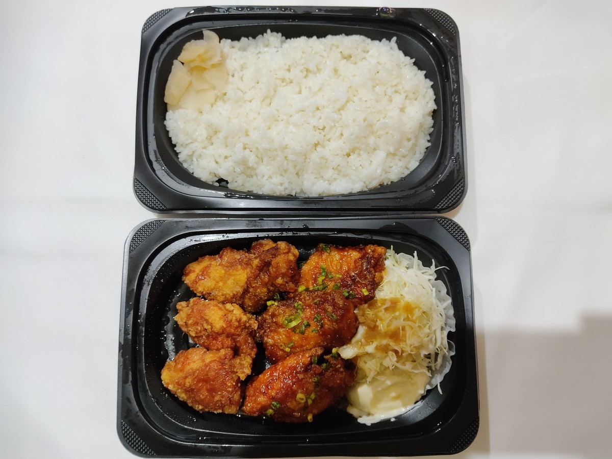 2021-09-17 夕食 食事 ウーバーイーツでから好し(藤沢弥勒寺店)の合盛り弁当6個を注文した。1070円+サービス料・配達料。 ご飯大盛りにしたら、思ったよりしっかり大盛りで満腹になった。メニュー説明によると「秘伝の甘とろダレとオリジナルももから揚げの両方が楽しめます」とのこと。写真の左側3つがオリジナルなのかな? どちらもおいしいので、同じの6個でも満足度は変わらなかっただろうなー。